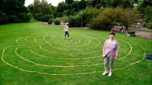The classical labyrinth form is a compelling shape, and as it began to appear, passers-by stopped to watch. Sometimes it seems to me that the labyrinth acts as a net, catching people and animals in its intriguing threads. Our visitors were welcomed in and invited to join us as companions in our walking.  We especially admired the fleet footed running of Lucia! We hoped that many more visitors would walk our labyrinth before the squirrels, birds and mice of the garden nibbled the grains away and it slowly returned to green.